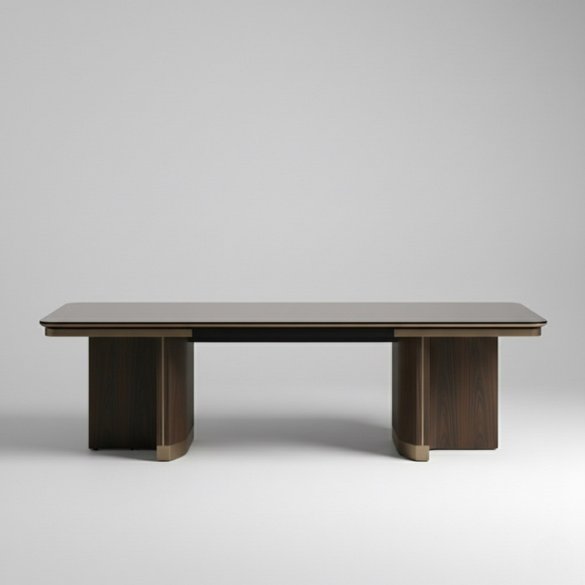 Defined by its bold geometric base and seamless proportions, this dining table embodies a refined sense of luxury. The smooth, lacquered tabletop rests gracefully atop sculpted wooden legs, accented with subtle metallic detailing that adds a touch of understated opulence. Its linear form and warm material palette create a timeless aesthetic that complements both contemporary and classic interiors. Crafted for those who value design precision and presence, this table transforms every meal into an experience of elegance and connection.