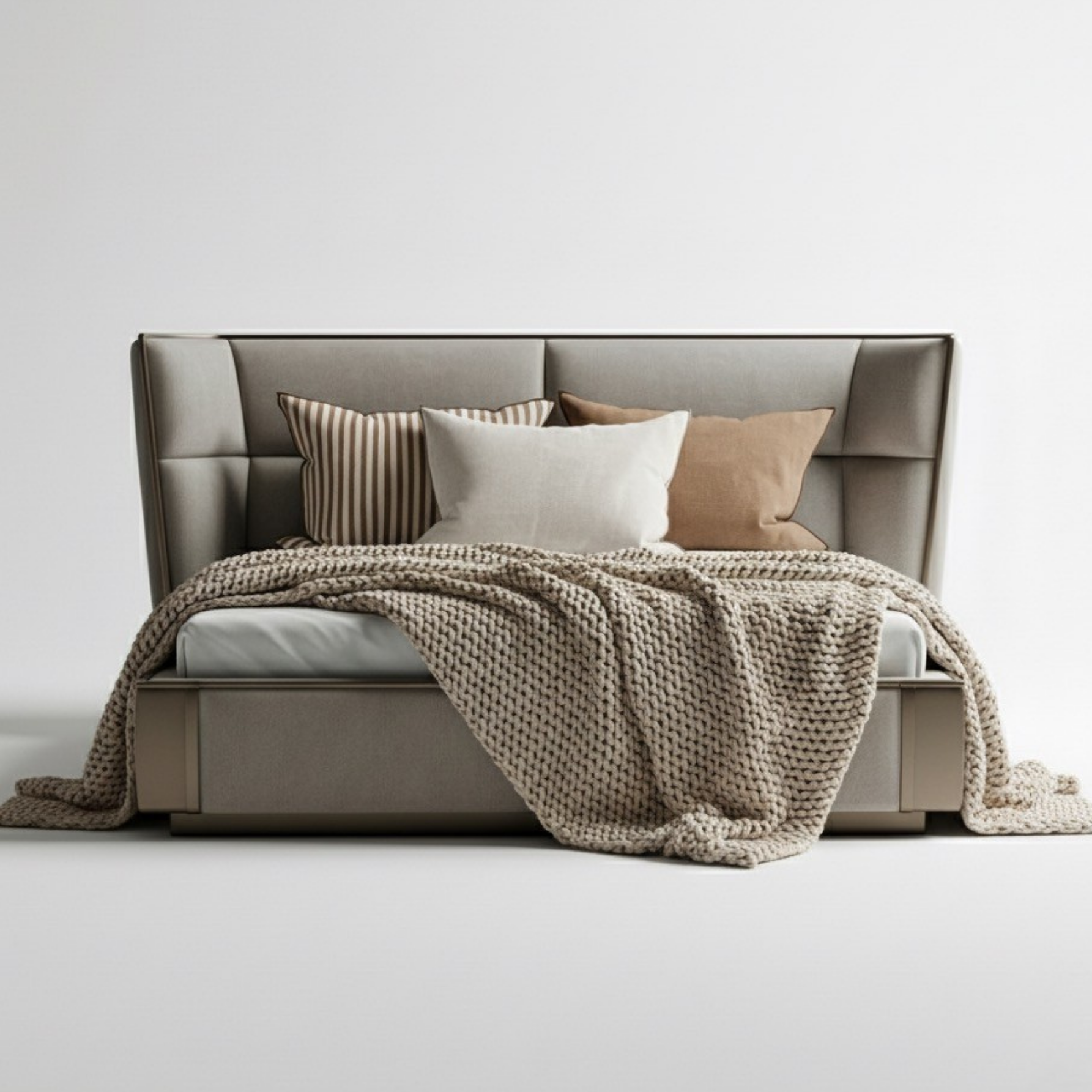 Its gracefully contoured headboard and meticulous upholstery, this bed brings architectural precision to everyday comfort. The warm neutral palette and inviting textures evoke a sense of calm sophistication, while the refined detailing adds depth and character. Designed for modern interiors, it balances clean geometry with a soft, enveloping presence — creating a restful focal point that enhances both style and comfort in your space.