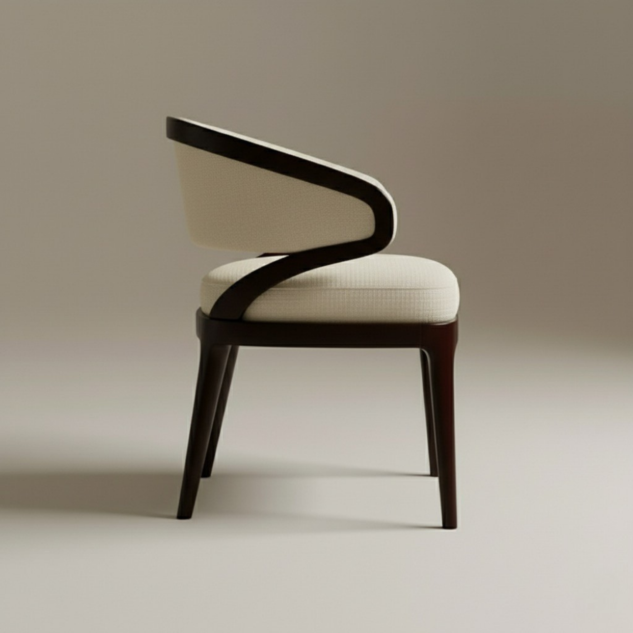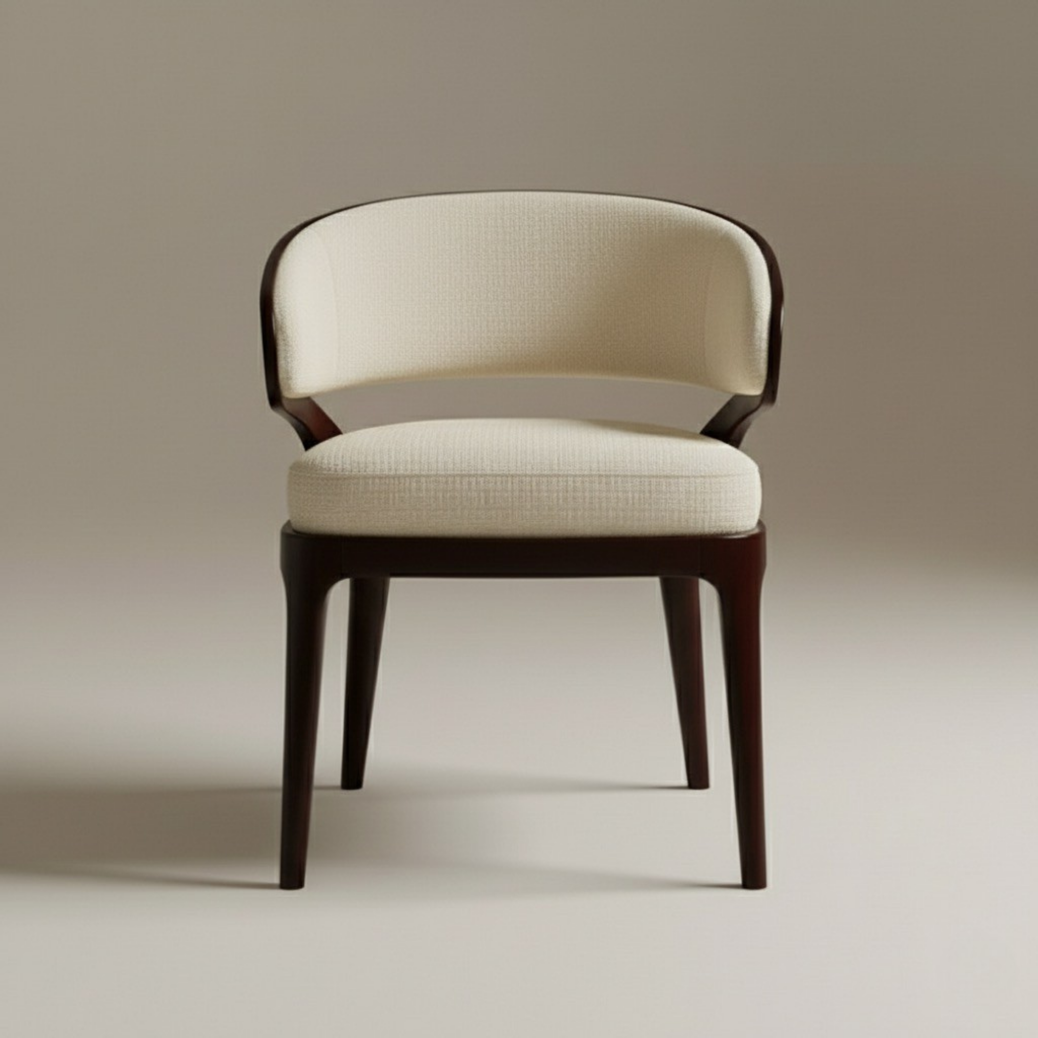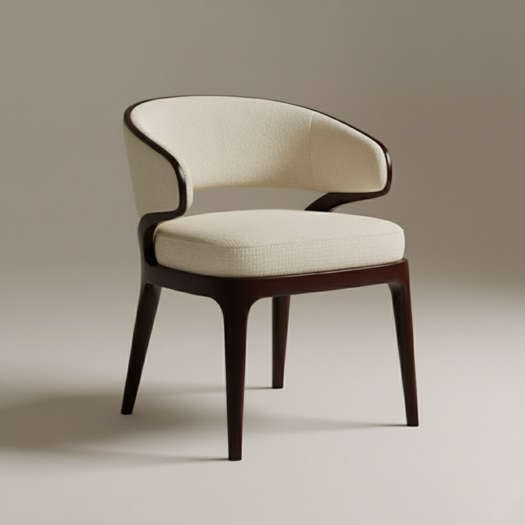 The inner backrest and generously padded seat are upholstered in a textured, cream or off-white fabric, providing a soft contrast to the dark wood. The upholstery is expertly tailored, offering a plush yet supportive sit. A dark piping detail along the edge of the upholstered backrest subtly outlines its crescent shape, echoing the dark wood frame and adding a meticulous finishing touch.