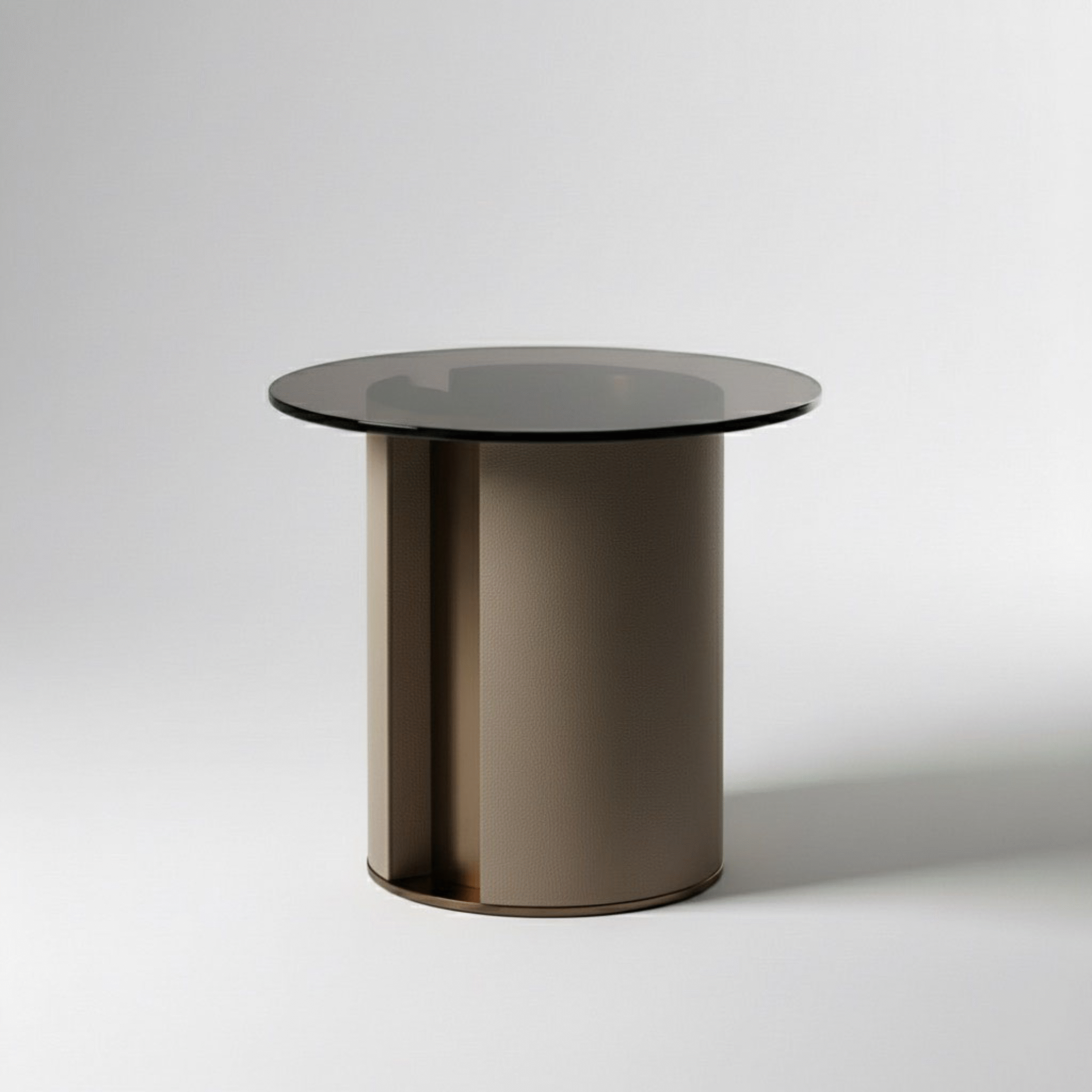 This metallic accent flows seamlessly down to a matching thin metal ring at the very bottom, grounding the piece with a touch of glamour. Topping the base is a circular pane of translucent smoked glass, which adds a cool, reflective surface perfect for resting a drink, a book, or a small decorative object.