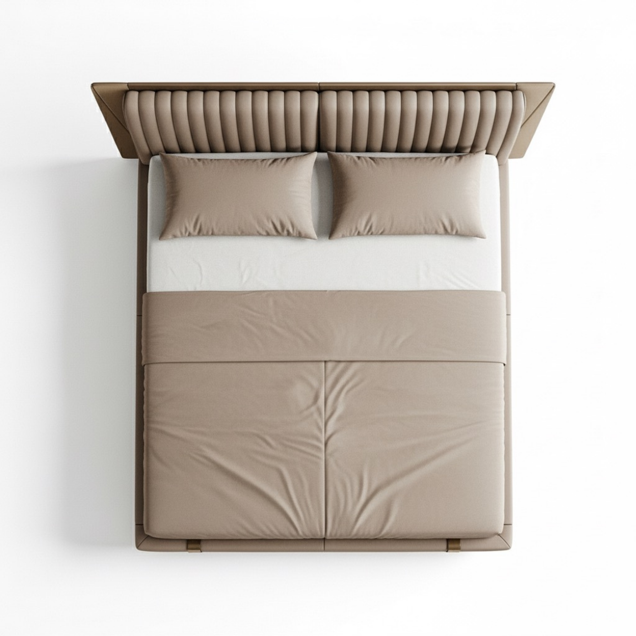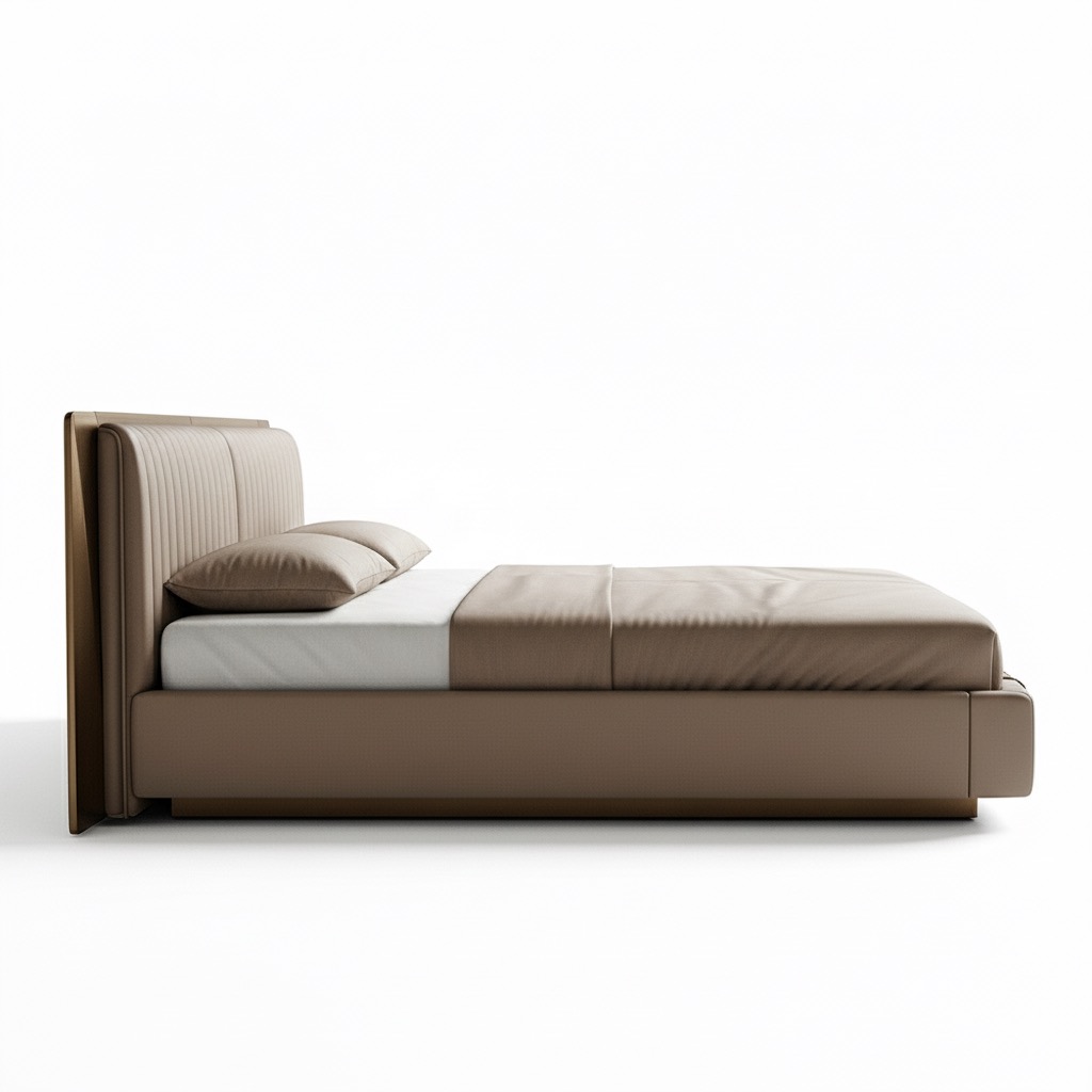 This contemporary upholstered bed embodies understated luxury with a timeless silhouette. Its clean-lined headboard, crafted in smooth neutral upholstery, creates a refined backdrop for rest, while the low-profile frame enhances a sense of modern minimalism. Soft edges and subtle curves lend warmth to its structured design, balancing elegance with comfort. Finished with meticulous detailing and a harmonious blend of tones, this bed stands as both a statement piece and a sanctuary—where design sophistication meets everyday serenity.