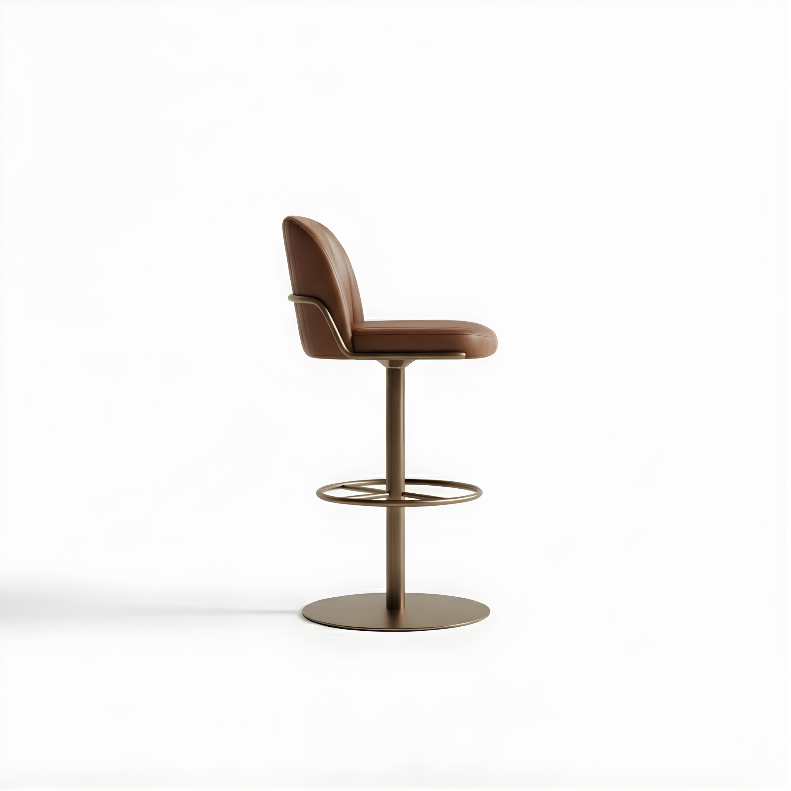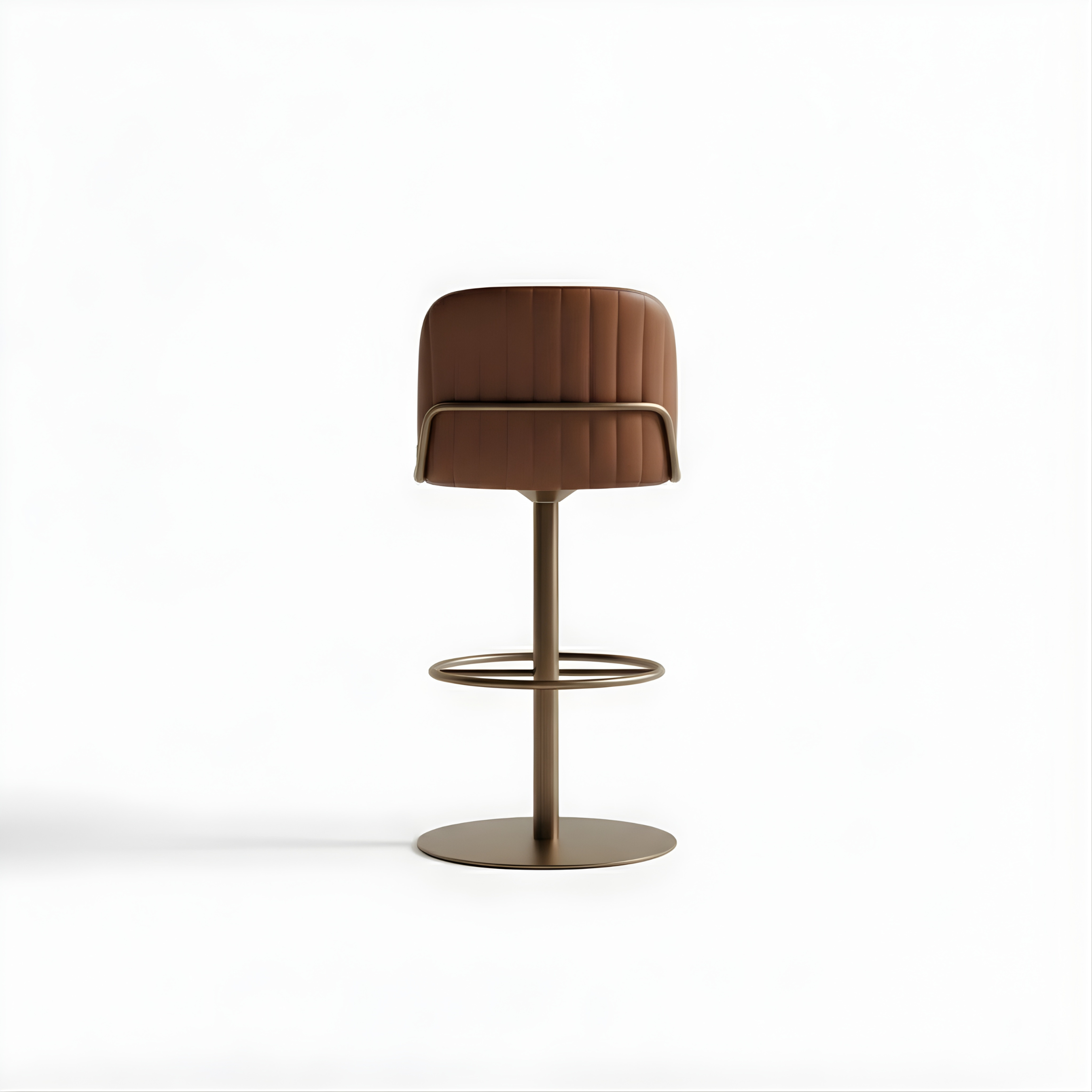 Exuding quiet luxury, this bar chair features a gracefully contoured backrest upholstered in supple leather with vertical channel detailing that accentuates its modern silhouette. The seat rests atop a sleek, matte metal pedestal base with a built-in footrest for added comfort and stability. Perfect for elevated dining or sophisticated bar settings, its warm tone and streamlined form bring a refined sense of modern allure to any interior. Designed to offer both durability and distinction, this piece embodies the art of effortless sophistication.