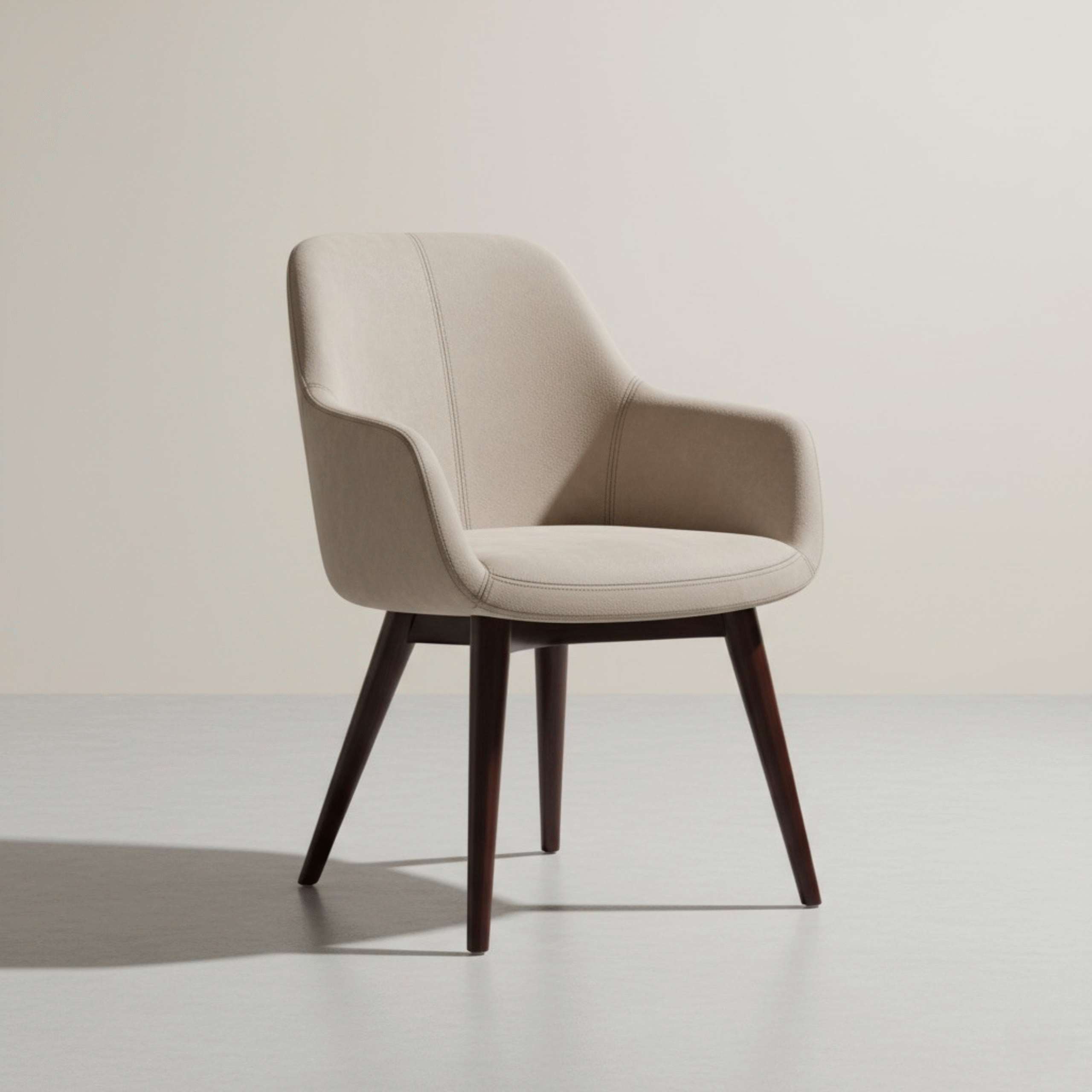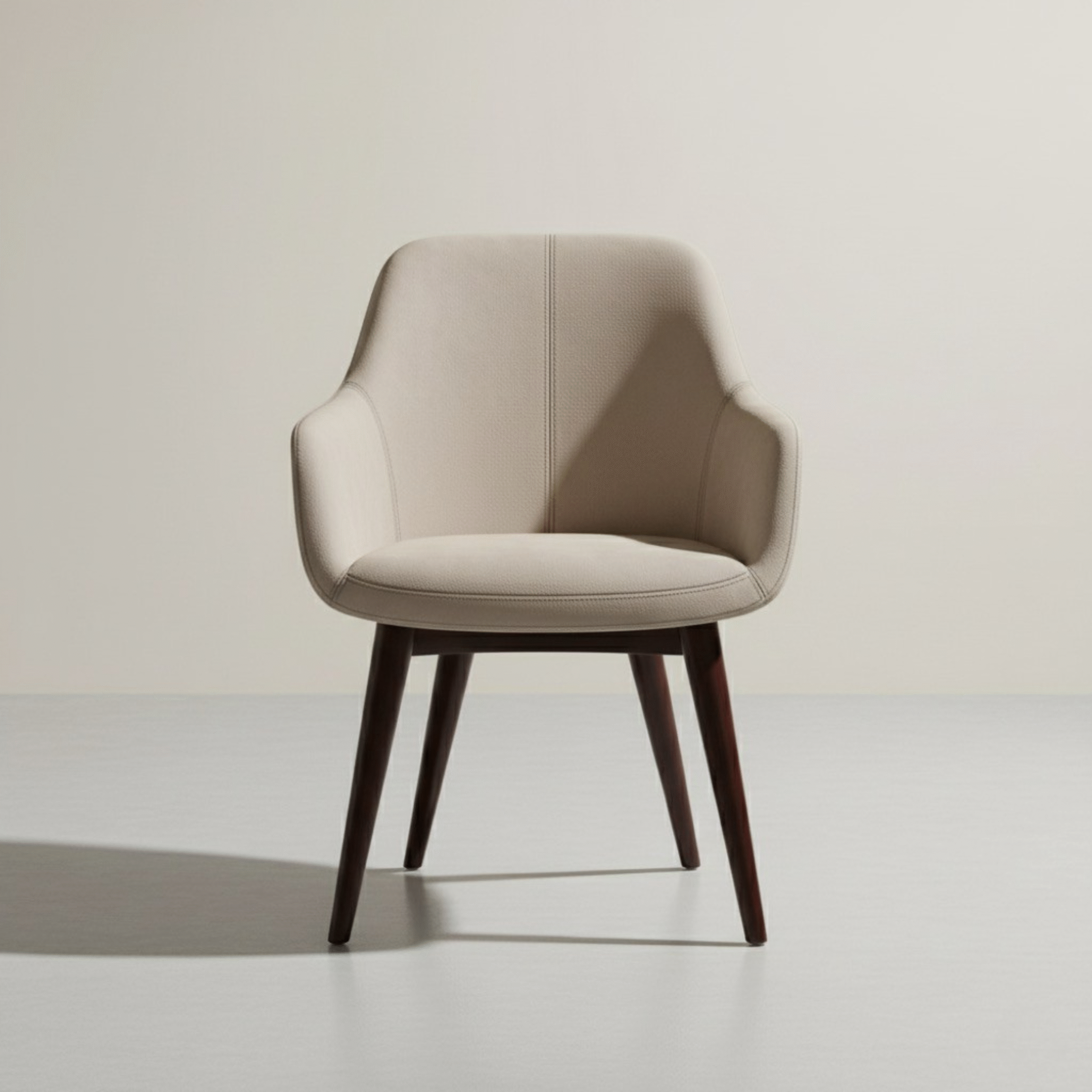 The chair is a study in balanced proportion and understated sophistication. Its gently curved back and embracing armrests create a seamless flow that invites both comfort and poise. Upholstered in soft fabric with tailored stitching, it rests gracefully on tapered wooden legs finished in deep walnut tones. Blending timeless craftsmanship with modern sensibility, It complements any contemporary dining setting, a perfect fusion of comfort, clarity, and effortless elegance.